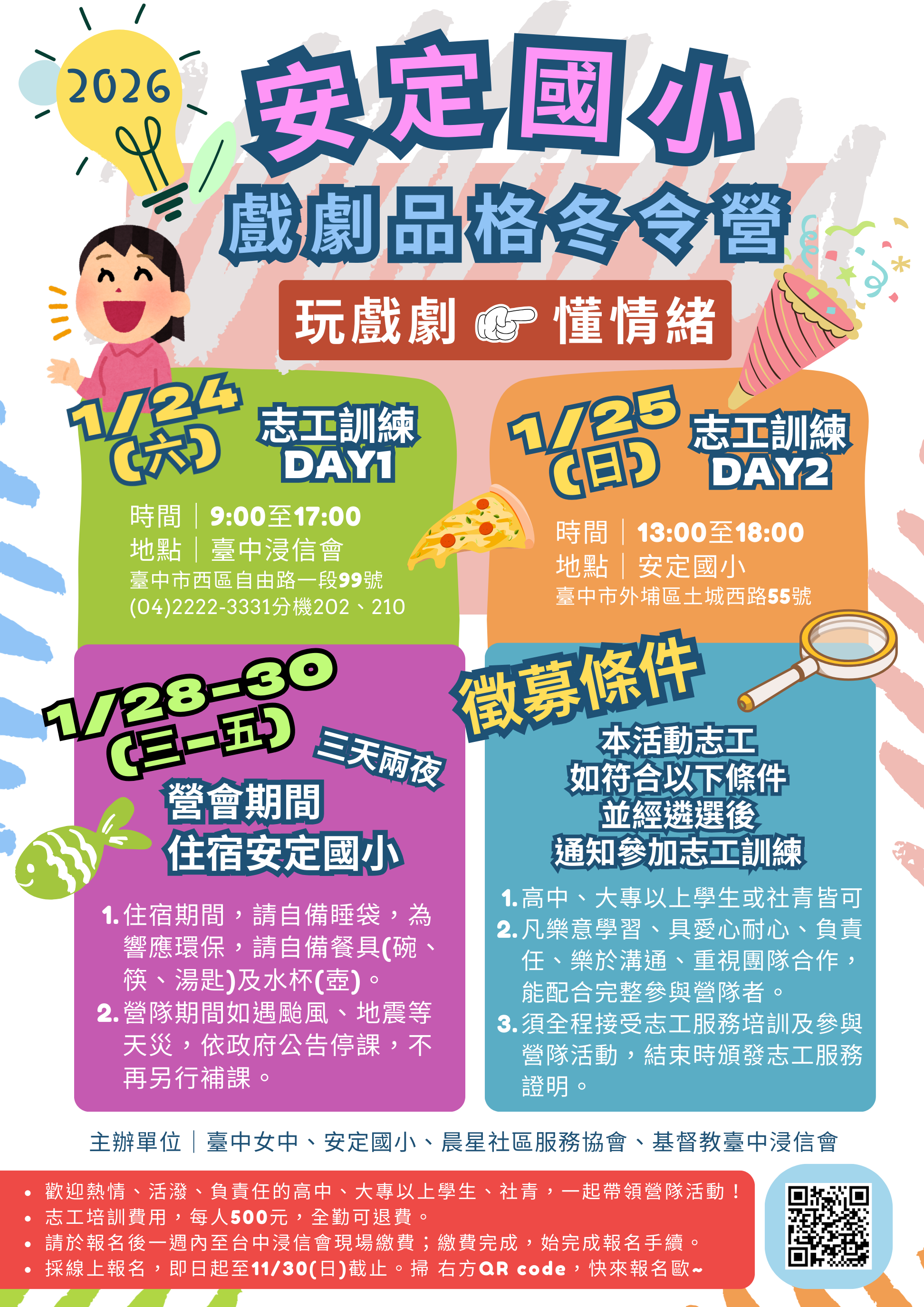 教會將於明年1/28-30再次差派短宣隊前往安定國小舉辦「兒童戲劇品格冬令營」,志工熱烈招募中...