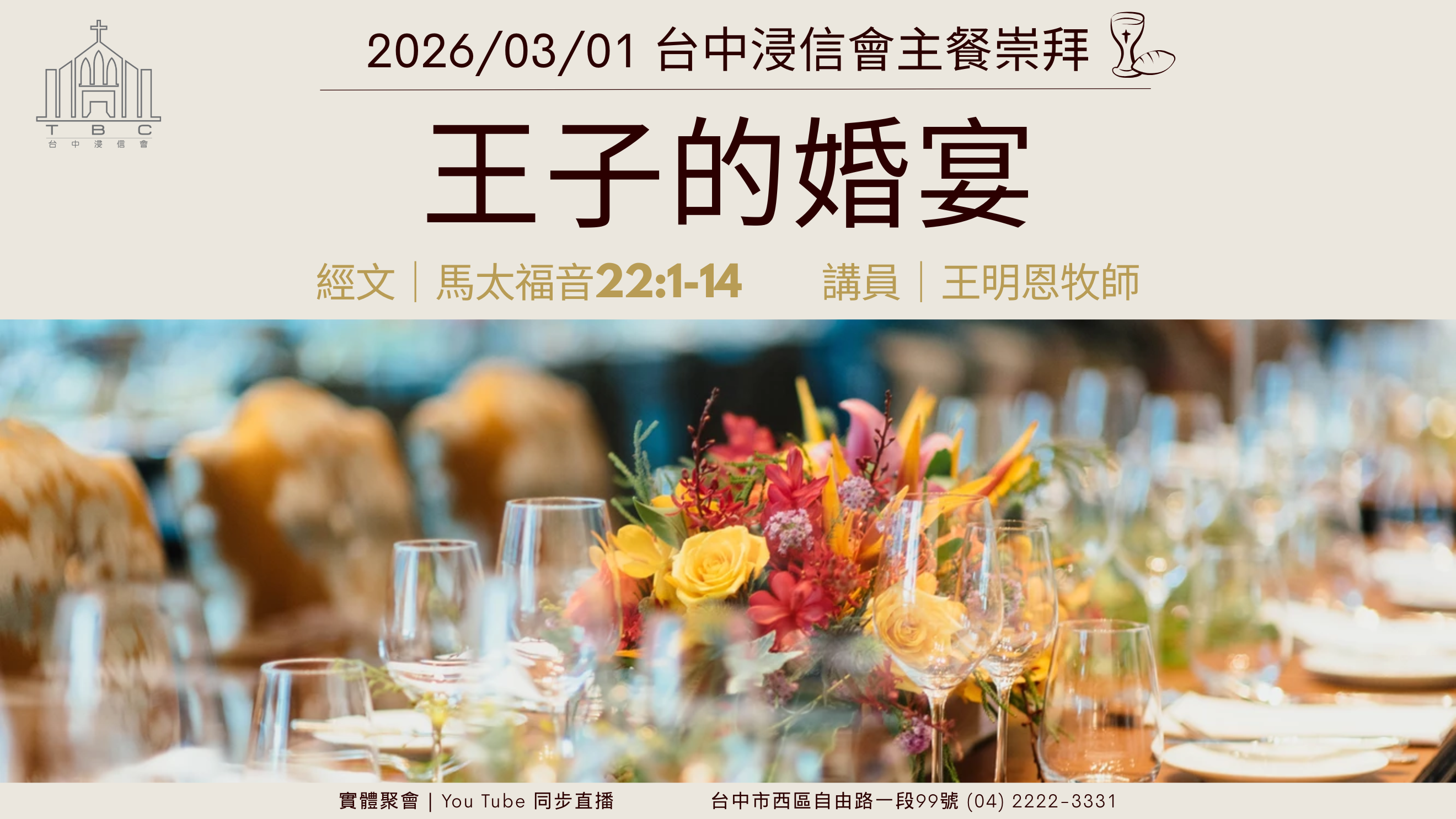 3/1主日崇拜,由本會王明恩牧師證道及主理主餐。